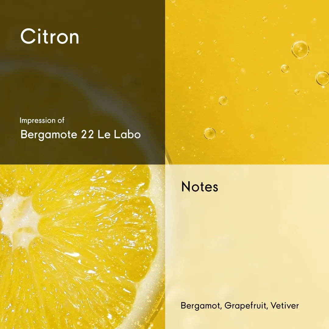 A radiant citrus burst that captures the soul of Mediterranean light, Citron is a sun-drenched blend of sparkling bergamot and juicy grapefruit, softened by the green nuance of petitgrain. As it unfolds, delicate orange blossom adds a breezy floral touch, resting on a clean, woody base of cedar, vetiver, and sensual musk. Fresh, sophisticated, and effortlessly modern, it’s summer in a bottle, all year round.