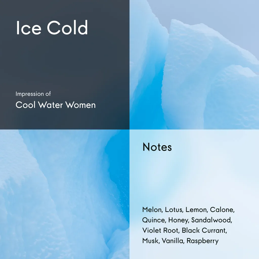 Ice Cold is a refreshing aquatic fragrance that captures the essence of the ocean breeze. Perfect for daily wear, Ice Cold is ideal for the modern woman who embodies confidence and grace, with a subtle allure that leaves a lasting impression. A timeless classic, it evokes the serene beauty of the sea.