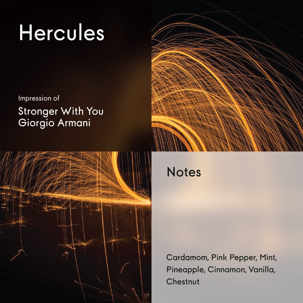 Hercules is a fragrance of strength wrapped in warmth, bold, sensual, and full of charisma. It opens with a lively burst of cardamom and pink pepper, made fresh with a touch of mint and juicy pineapple. As it deepens, warm waves of cinnamon and creamy vanilla fold into roasted chestnut, creating a seductive trail that lingers with addictive charm.